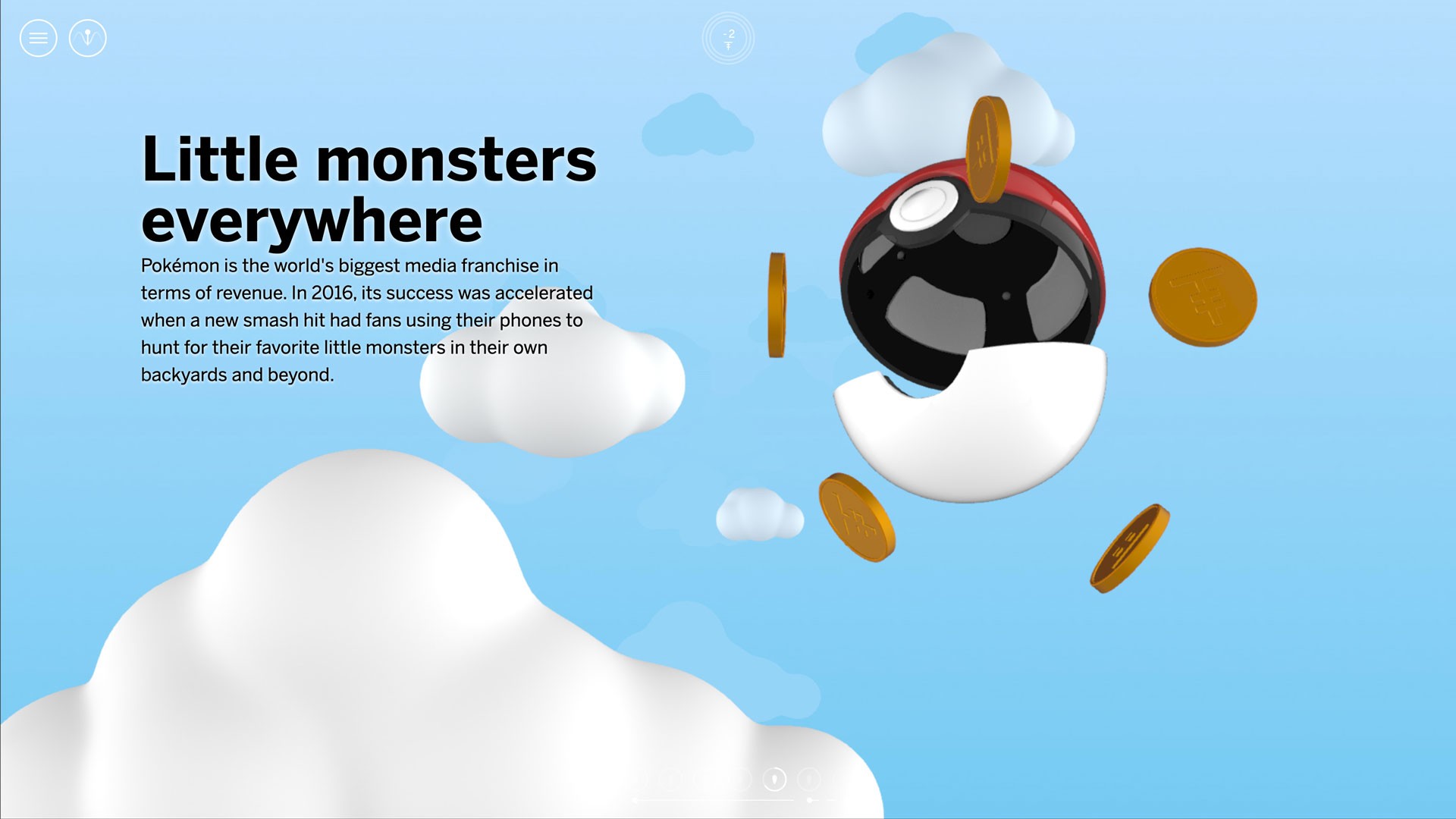 On your journey you collect coins by engaging with little easter eggs: feeding a tamagochi, spinning a Disco Ball or inserting a tape into a walkman. When you reach the present, you can invest those coins in certain megatrends.