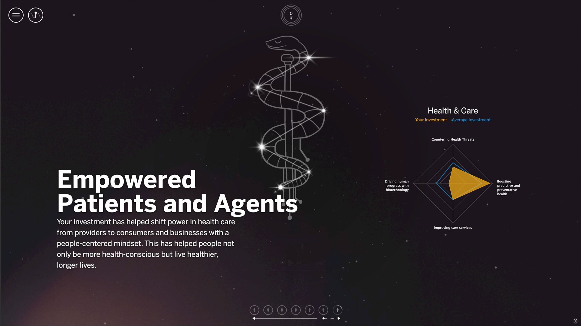 Do you care about Health & Care? Or will you invest more in Sustainability? In the great finale you will fly into space, and peak into the future your investments might create.